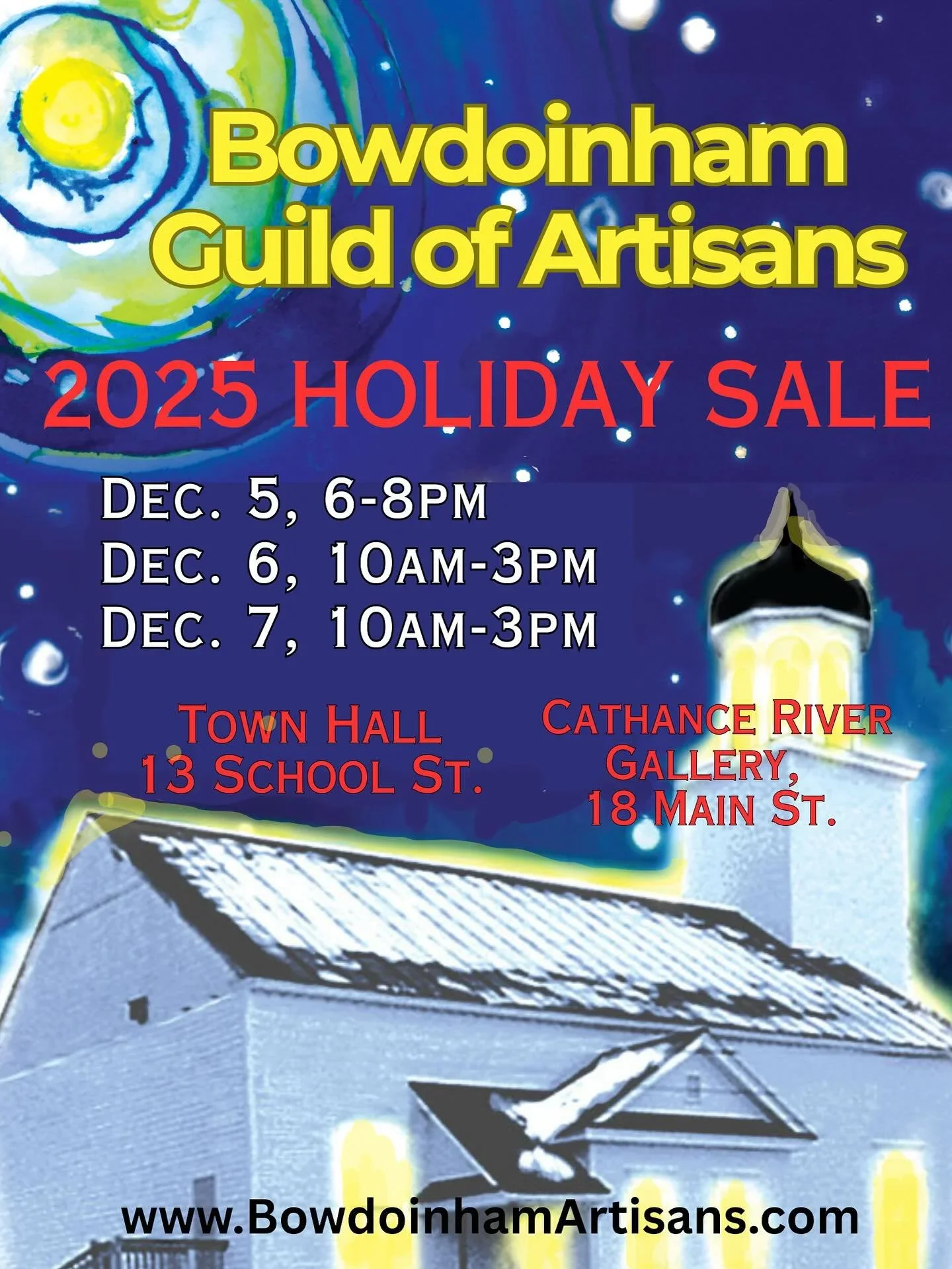 Five local Bowdoinham artists who were looking for a way to provide a resource to each other as well as a way to promote their art started the Bowdoinham Guild of Artisans in 2004. Initially, they set up three shows a year including a spring show, a presentation at Celebration Bowdoinham and the Holiday Show at the Town Hall. Over the years, other artists joined them and although there is only one of the original members still in the Guild, there are currently twenty members. This diversified group represents a wide range of artistic endeavors including: painting, fine art photography, fiber arts, woodworking, ceramics, stained glass and jewelry.